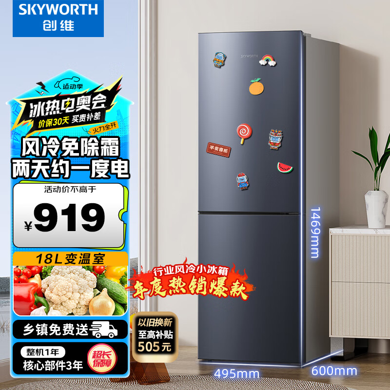 创维(SKYWORTH)188升双门小型冰箱 风冷无霜两门家用电冰箱 电脑控温 节能低音租房公寓宿舍P18WY价格:919.00元!