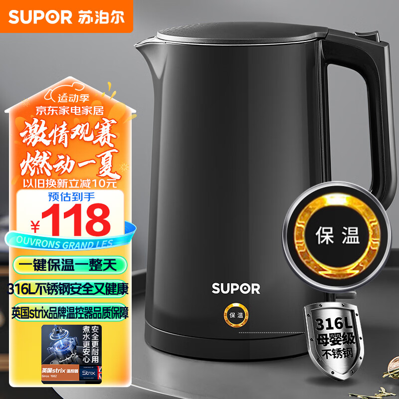 苏泊尔(SUPOR)电水壶热水壶 1.7L全钢无缝双层防烫电热水壶 316L不锈钢烧水壶 一键保温恒温 SW-17J12P价格:118.00元!
