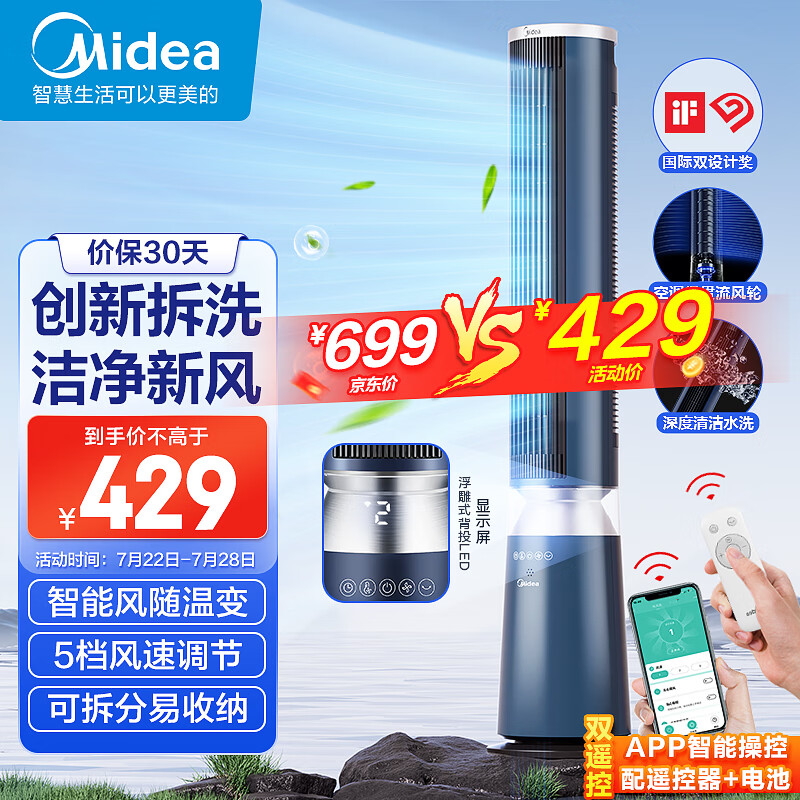 美的(Midea)【一键分离式】WiFi智联塔扇/风随温变电风扇/家用立式摇头宿舍落地扇/大风力无叶风扇ZDF10PXJ价格:529.00元!
