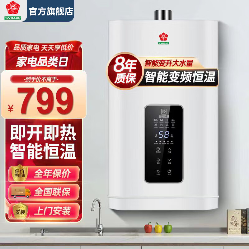 4、樱花燃气热水器,低水压启动,精准燃气比例阀,灵敏水流传感器,智能恒温,即开即热,告别忽冷忽热,纯白色外观造型精致,时尚大方。