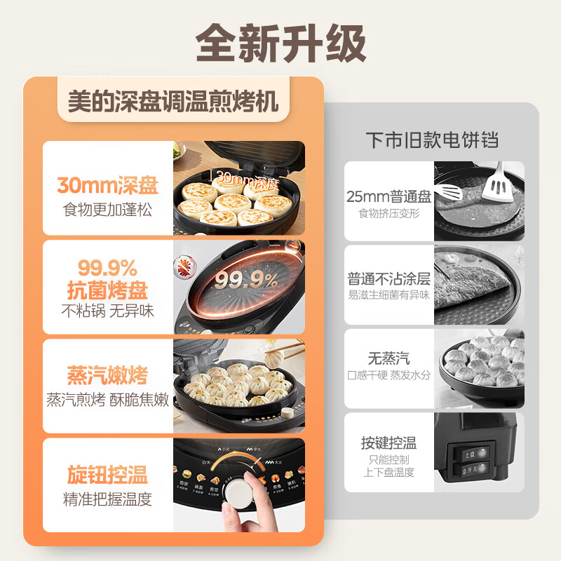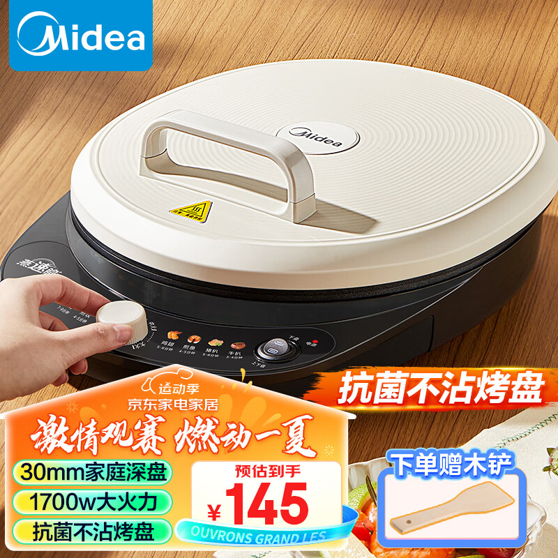 美的(Midea)电饼铛家用煎烤机烙饼锅早餐机1700W大火力围炉煮茶蒸汽烤肉薄饼机加深双面加热电饼档JKC30J58价格:145.00元!