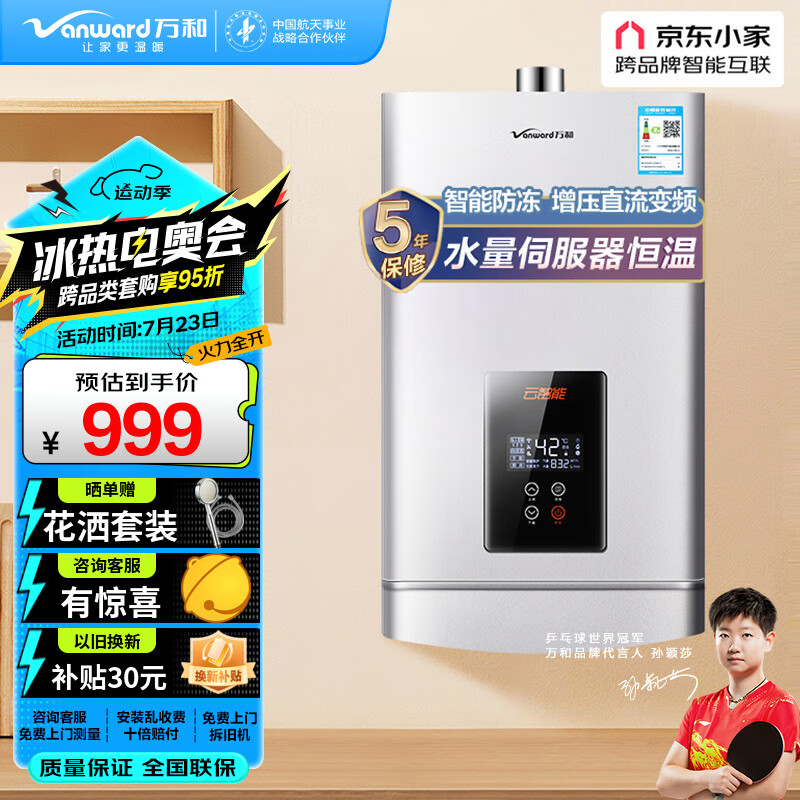 万和(Vanward)13升燃气热水器京东小家智能生态天然气防冻 直流变频 增压水量伺服器恒温 JSQ25-560J13 以旧换新价格:999.00元!