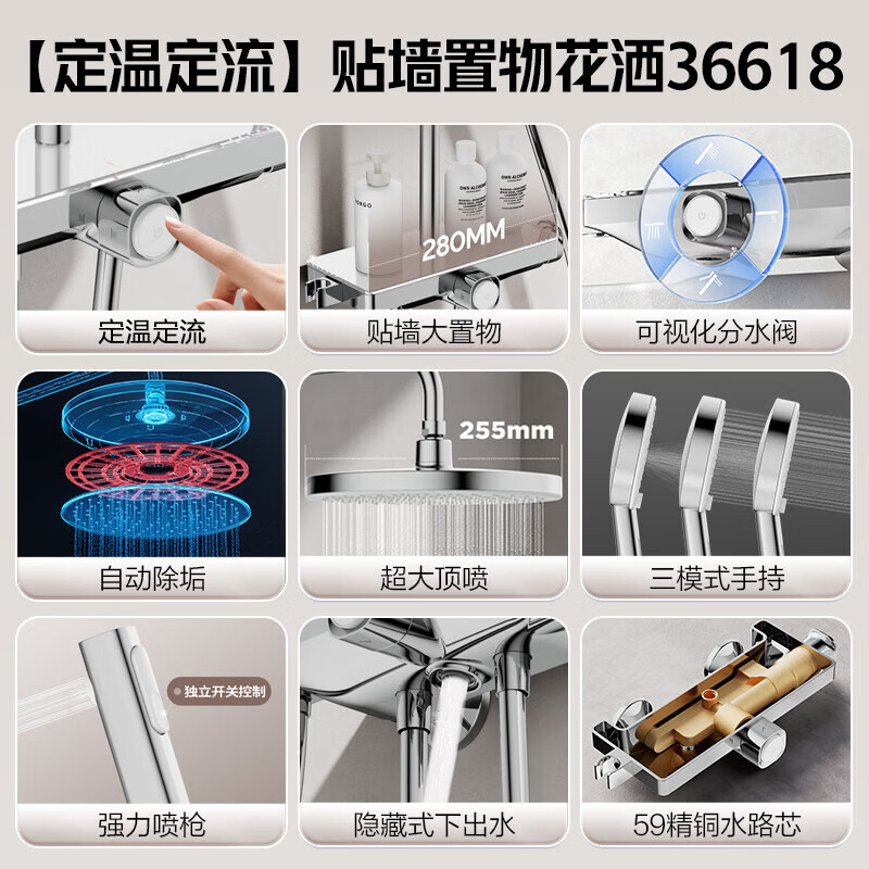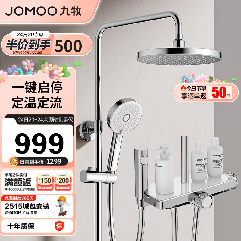 九牧(JOMOO)贴墙置物除垢一键启停定温定流淋浴花洒套装36618-783/1B-1价格:1199.00元!