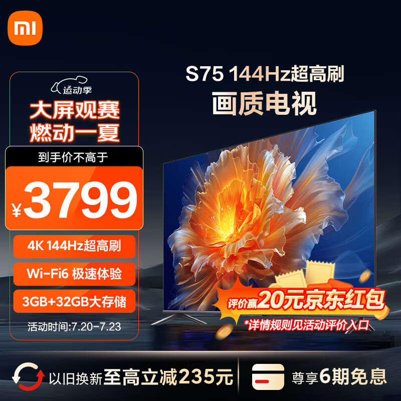 小米电视S75 75英寸4K 144Hz超高刷全速旗舰游戏电视 WiFi 6 3GB+32GB 智能电视L75M9-S价格:3799.00元!