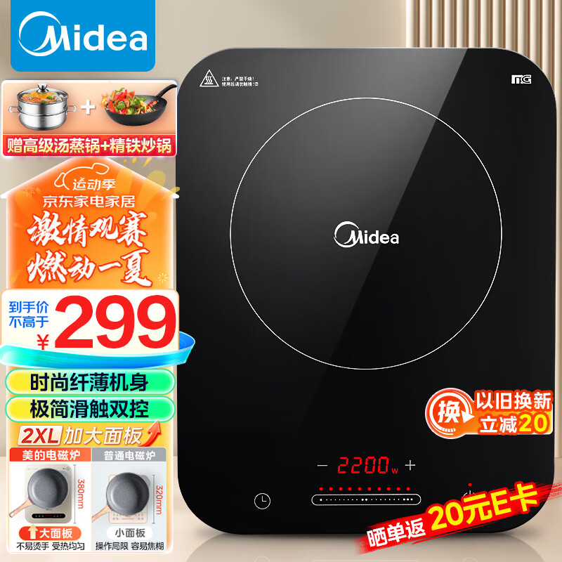 美的(Midea)电磁炉 家用大功率 2200W 恒匀火技术 智能断电 微晶面板 C22-WH2237(配汤蒸锅+渗氮炒锅)价格:299.00元!