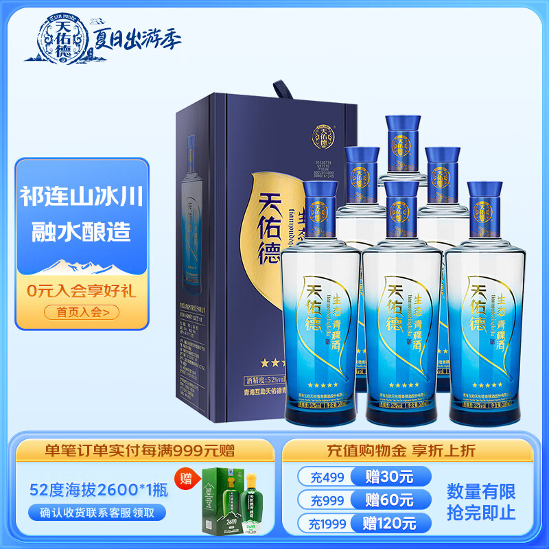 天佑德五星生态清香型白酒52度500ml*6瓶整箱装【青海青稞酒】价格:618.00元!