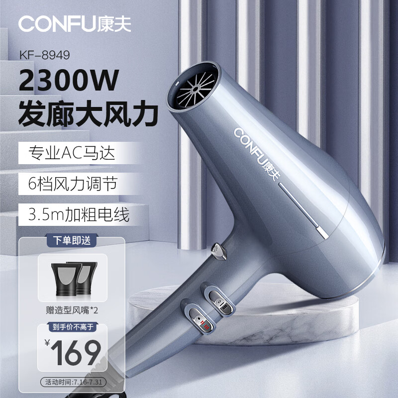 康夫(CONFU)家用电吹风机2300W大功率强劲大风力速干 恒温护发过热保护 发廊理发店吹风筒 KF-8949价格:169.00元!
