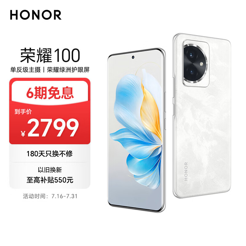 荣耀100 单反级主摄 荣耀绿洲护眼屏 第三代骁龙7 立体声双扬声器 AI手机 16+512 月影白 5G价格:2799.00元!