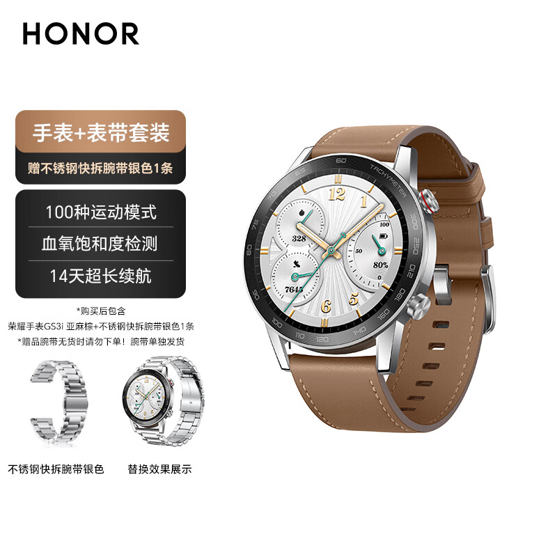 荣耀手表GS 3i 亚麻棕+钢表带版本 共计两条表带价格:499.00元!