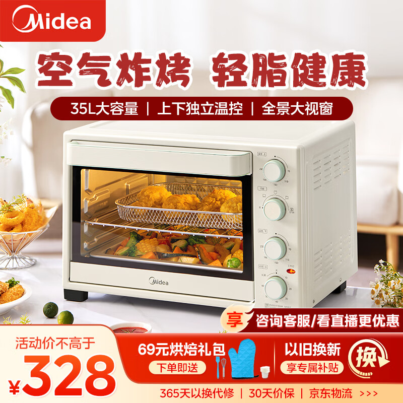 美的(Midea)35L家用多功能空气炸锅电烤箱一体机 热风空气炸/独立控温/均匀烘烤PT3515价格:328.00元!