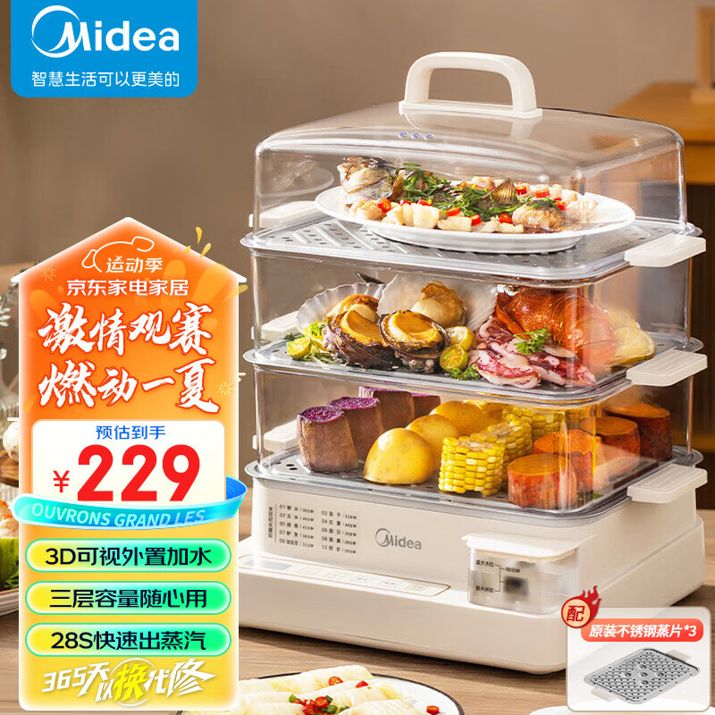 美的(Midea)电蒸锅 22L三层大容量外置加水蒸锅电蒸锅 透明视窗不锈钢蒸片多用途蒸包子锅多功能锅ZGC322301价格:229.00元!