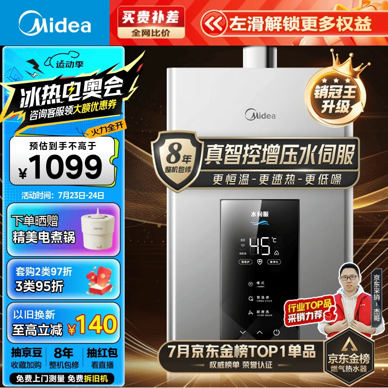 美的(Midea)13升燃气热水器 天然气 水伺服 智控增压 恒温 ECO节能 磁净化健康洗JSQ25-MK6以旧换新价格:1099.00元!