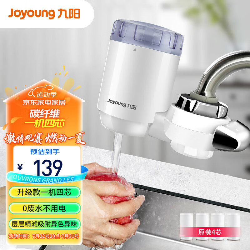九阳 (Joyoung) 净水器水龙头台式前置净水机家用厨房过滤器碳纤维净水器一机四芯套装JYW-T12价格:139.00元!