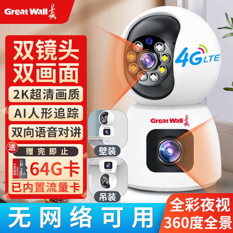 长城4G无线家用AI摄像头手机远程监控器360度无死角带夜视全景语音自动旋转可对话室内外无需连WiFi价格:152.00元!