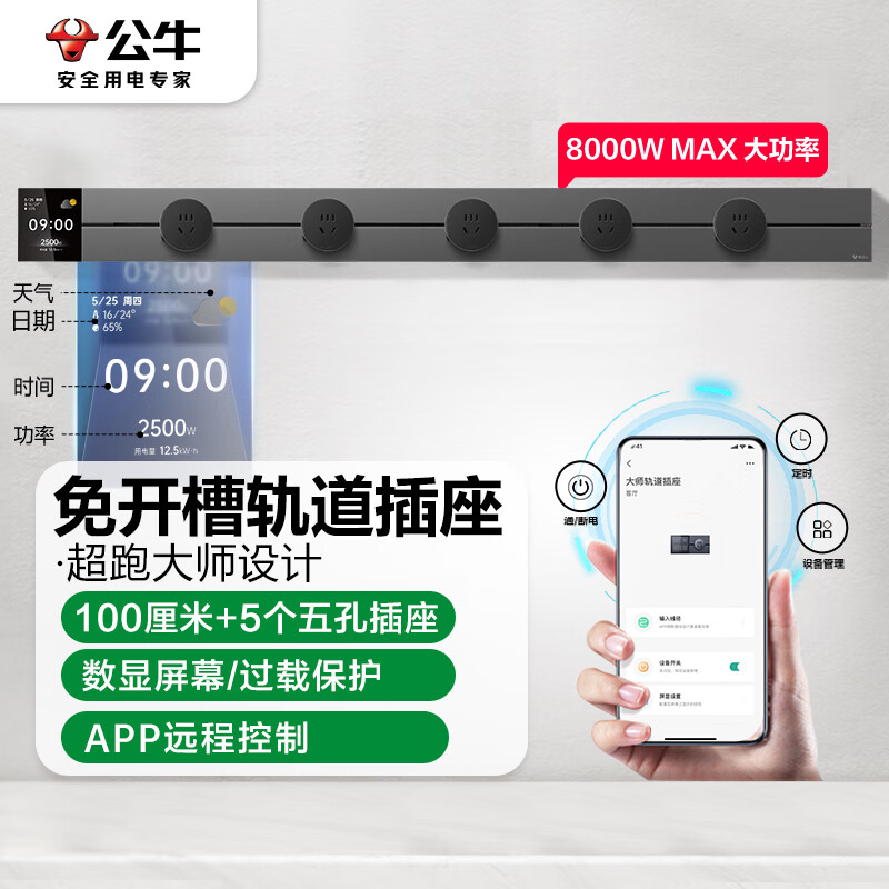 公牛(BULL)明装 轨道插座 大师屏显款可移动墙壁插座壁挂式滑轨插座 免打孔APP控制 100厘米轨道+5个五孔灰价格:1124.00元!