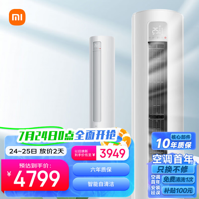 小米3匹 新一级能效 变频冷暖 智能自清洁 巨省电 客厅圆柱空调立式柜机 KFR-72LW/N1A1价格:4799.00元!