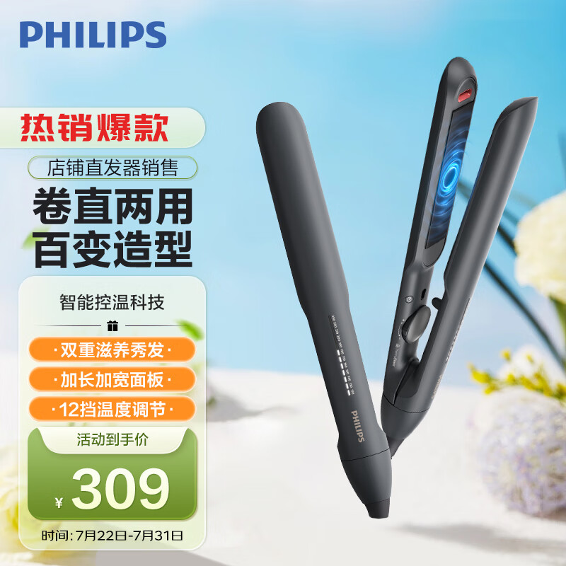 飞利浦(PHILIPS)电卷发棒 直板夹 智能温控 卷直两用 夹板小滑板 七夕情人节礼物送礼 BHS510/05 黑色价格:309.00元!