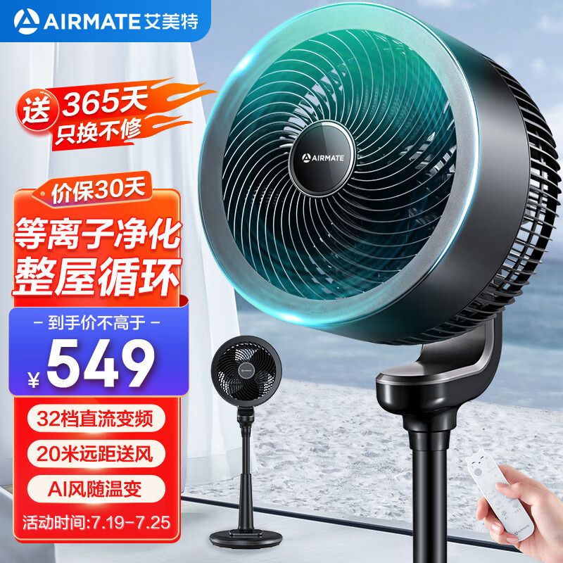 艾美特(AIRMATE)“黑天鹅升级款”空气循环扇等离子净化32档直流变频家用落地扇3D自动摇头台立式电风扇 RDI82-1价格:489.00元!