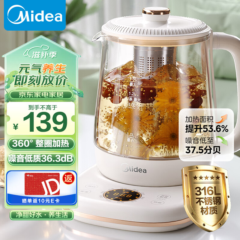 美的(Midea)精粹小气泡养生壶 母婴级316L不锈钢煮茶壶 360°加热降噪烧水壶 11档控温恒温电热水壶MK-YS15P301价格:139.00元!