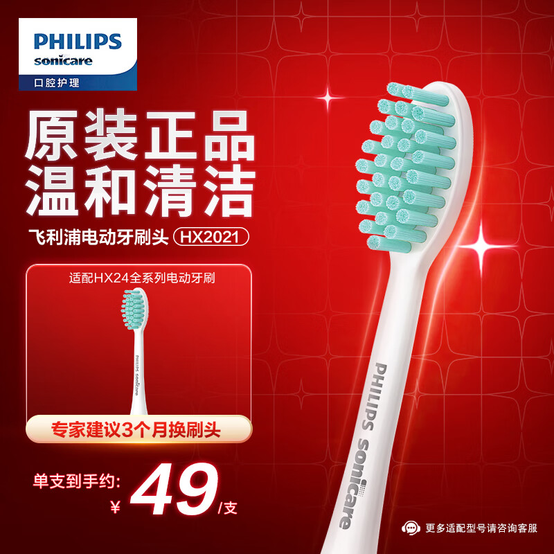 飞利浦电动牙刷头 3D软毛呵护牙龈 1支装 HX2021/02 适用于 HX24全系列电动牙刷价格:49.00元!