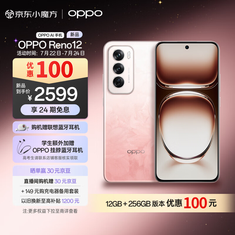 OPPO Reno12 超美小直屏 安卓Live图 天玑旗舰芯 12GB+256GB 柔和桃 游戏智能 新款 AI影像5G拍照手机价格:2699.00元!