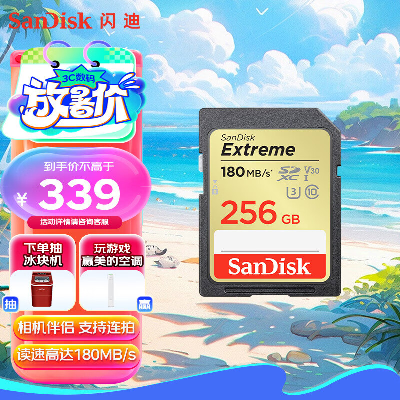 闪迪(SanDisk)256GB SD内存卡 4K V30 U3 C10 极速相机存储卡 读速180MB/s 写速130MB/s 高速连拍 坚固耐用价格:339.00元!