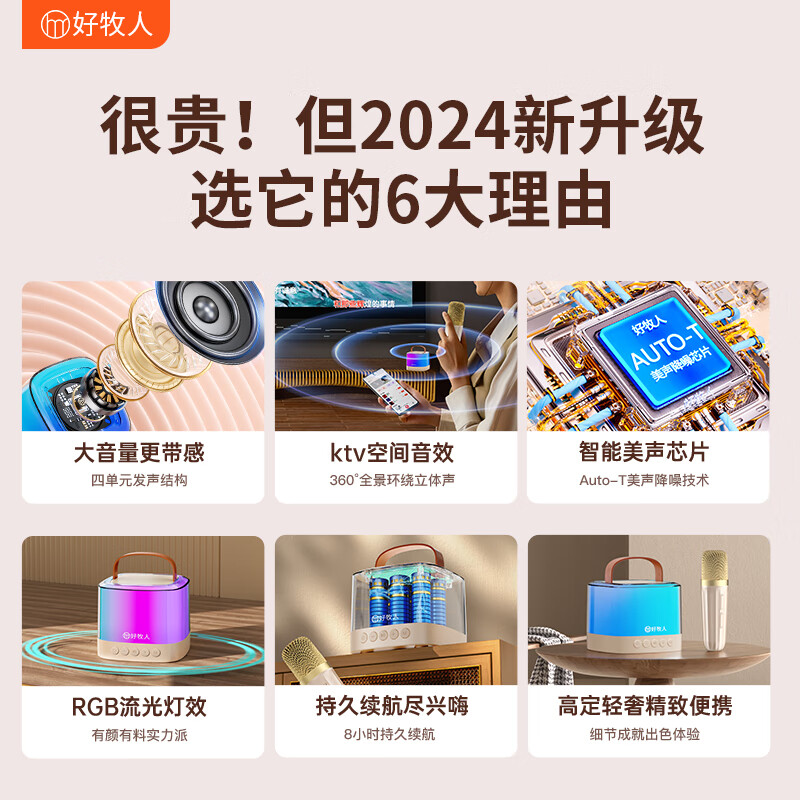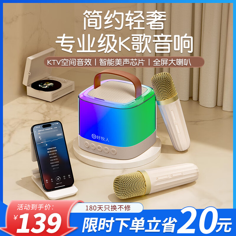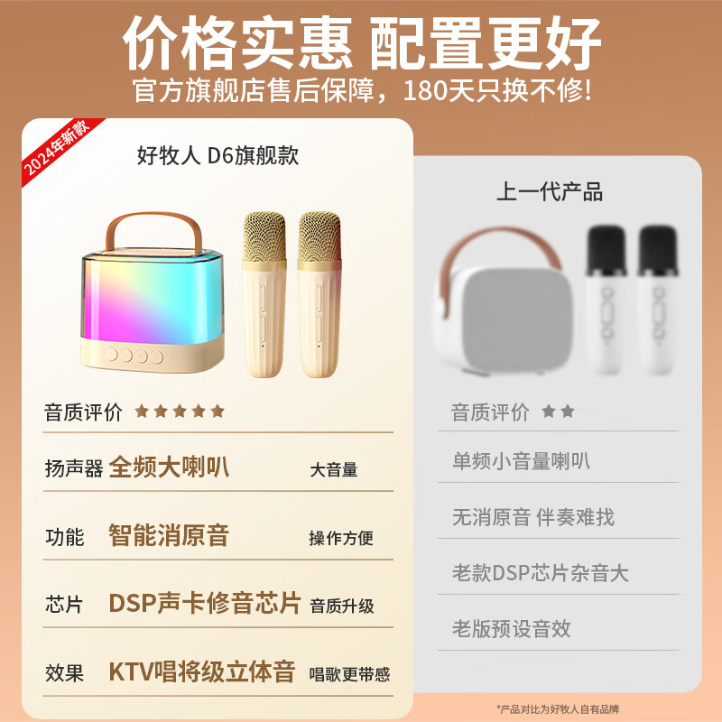 好牧人k歌麦克风话筒音响一体自带声卡家庭ktv套装无线蓝牙音箱唱歌神器一体式儿童娱乐卡拉ok户外家用D6价格:159.00元!