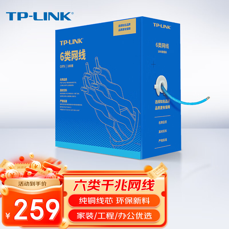 TP-link 六类千兆网线 原装CAT6类非屏蔽高速工程网线 纯铜双绞线 家装网络监控布线100米箱线EC6-100价格:259.00元!