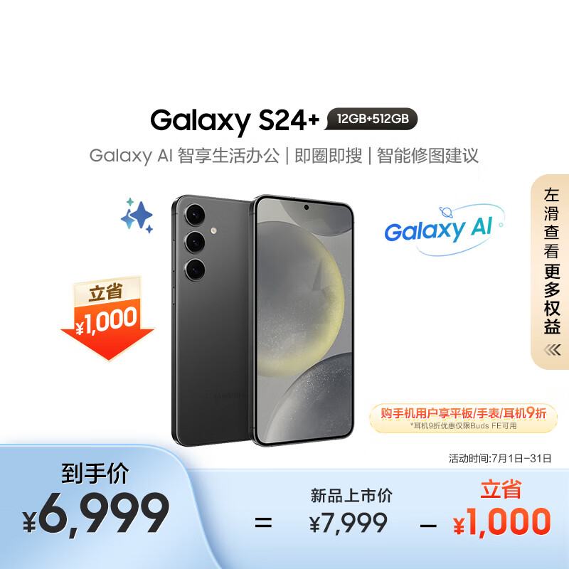 三星(SAMSUNG)Galaxy S24+ AI手机 智享生活办公 5000万像素 拍照手机 第三代骁龙8 游戏手机 12GB+512GB 水墨黑价格:6999.00元!