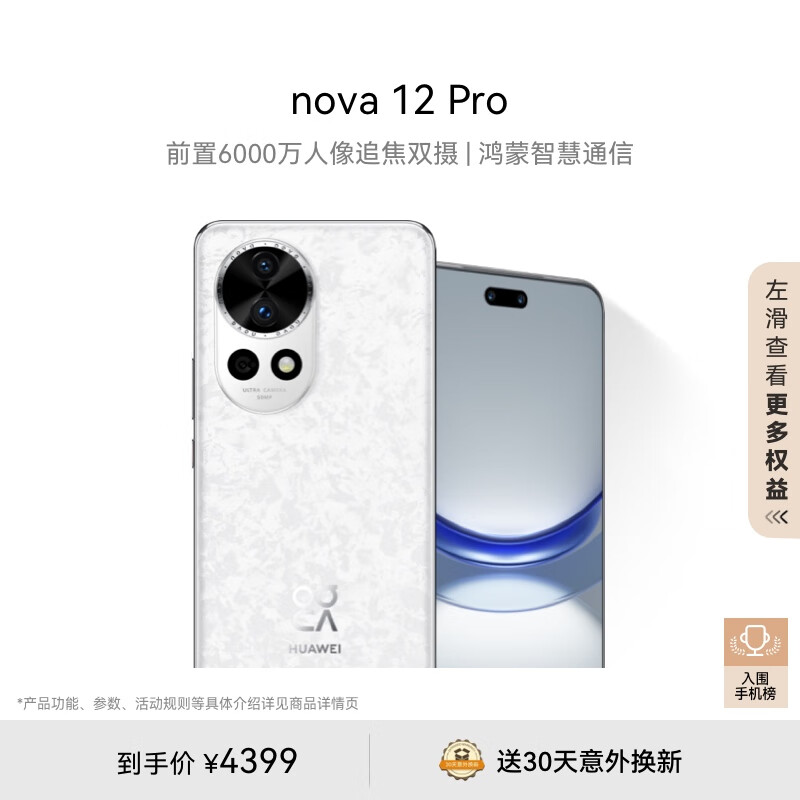 华为nova 12 Pro 前置6000万人像追焦双摄 512GB樱语白物理可变光圈 鸿蒙智慧通信智能手机nova系列价格:4399.00元!