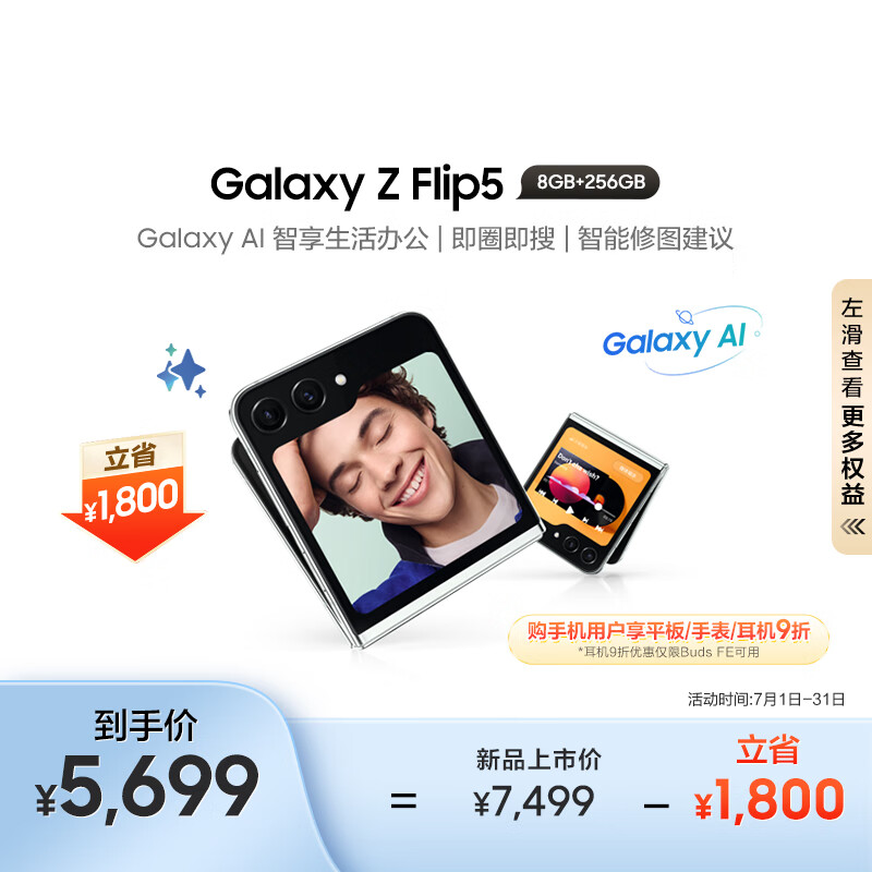 三星(SAMSUNG)Galaxy Z Flip5 AI手机 智能外屏 掌心折叠 同声翻译 智能修图摄像 8GB+256GB 冰玫紫 折叠屏手机价格:5699.00元!