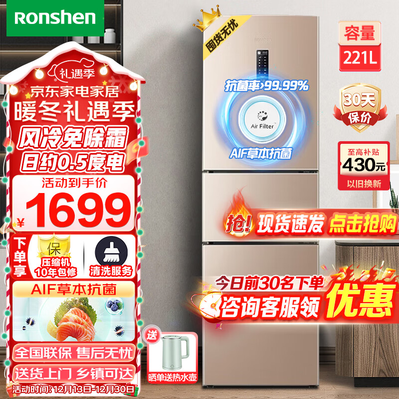 容声(Ronshen)冰箱 221升三门冰箱小型冰箱风冷无霜节能保鲜电冰箱三开门家用冰箱 BCD-221WD16NY以旧换新价格:1699.00元!