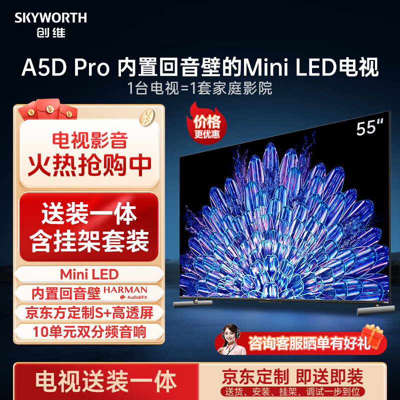 创维电视55A5D Pro 【送装一体版本】55英寸内置回音壁mini led电视机 智慧屏液晶4K超薄平板智能家电价格:3298.00元!