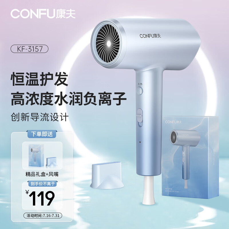 康夫(CONFU)电吹风机大功率1800W速干负离子护发宿舍家用生日礼物送女友吹风筒 KF-3157冰川蓝价格:149.00元!