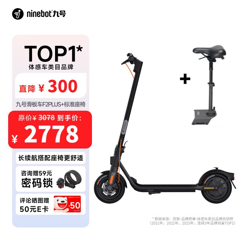 Ninebot 九号电动滑板车成人F2Plus+可折叠座椅套装便携可折叠智能九号电动车自修复胎55KM长续航价格:2778.00元!