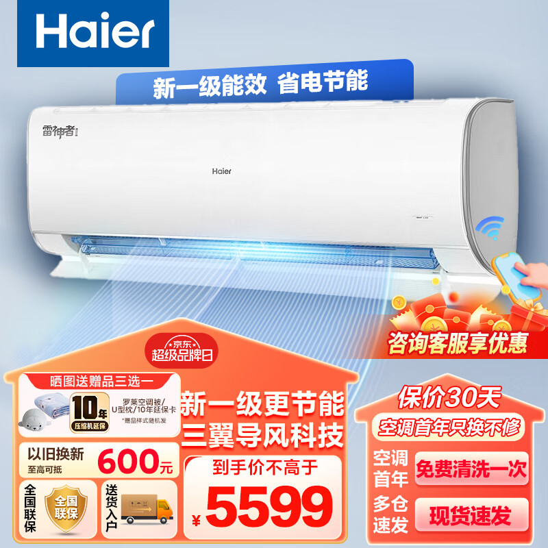 海尔(Haier)空调挂机2匹 雷神者 新一级能效节能省电 除菌自清洁 三翼导风 恒温舒适 智能物联 快速冷暖大风量价格:5599.00元!