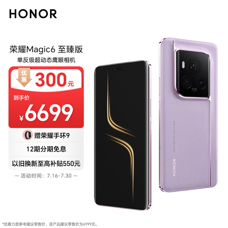 荣耀Magic6 至臻版 单反级超动态鹰眼相机 第三代骁龙8芯片 荣耀鸿燕通信 16+512 5G AI手机 天穹紫价格:6699.00元!