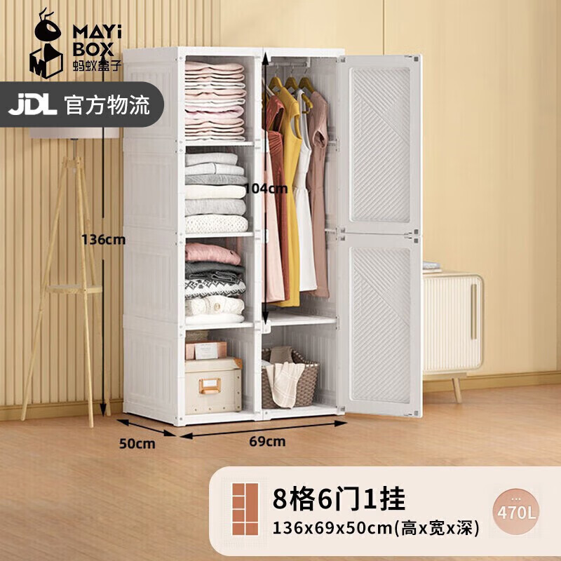 蚂蚁盒子(MAYIHEZI)免安装简易衣柜家用卧室出租房现代塑料柜收纳衣橱 白板8格6门1挂价格:399.00元!