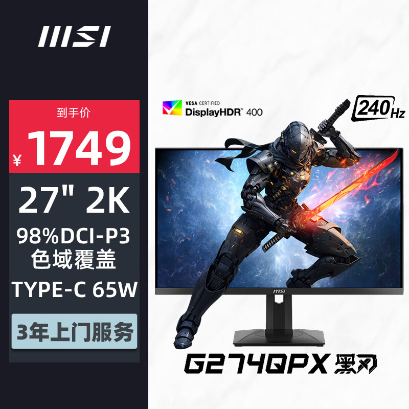 微星(MSI)27英寸 2K 240Hz HDR400 快速液晶IPS 1ms(GTG) TYPE-C 65W 黑刃 游戏电竞显示器屏 G274QPX价格:2199.00元!
