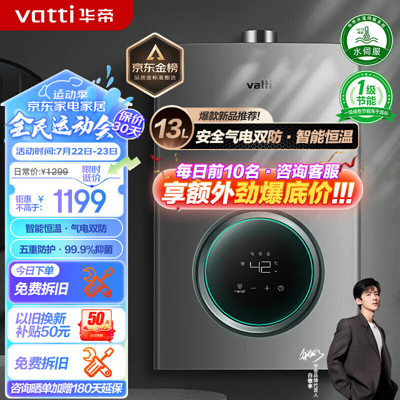 华帝(VATTI)燃气热水器 气电双断防护 水伺服级恒温强排 即热式热水器 防燃气泄漏保护 大升数低压启动 i12103 13L 天然气【一厨一卫】价格:1199.00元!