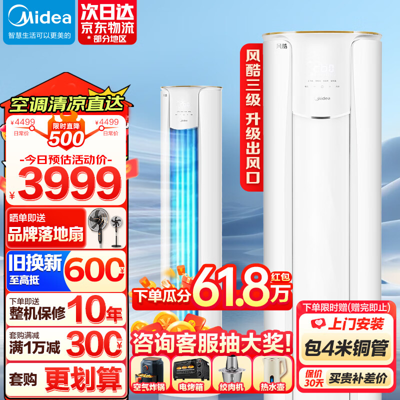 美的(Midea)空调2匹风酷三级能效变频冷暖客厅空调立式大风口落地式圆柱空调柜机 KFR-51LW/N8MJC3 多仓直发价格:3999.00元!