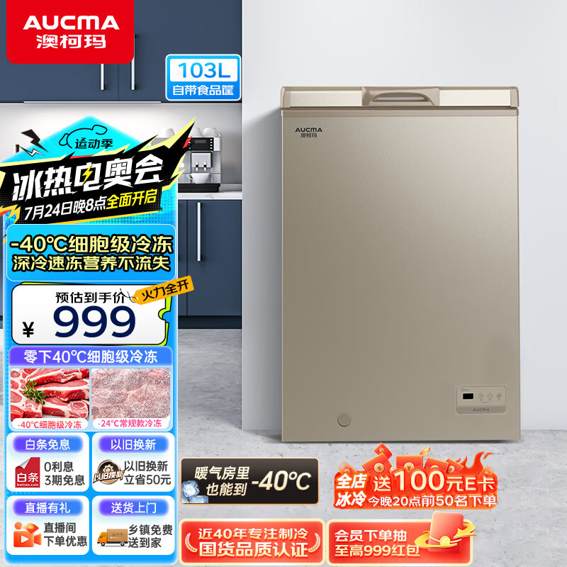 澳柯玛(AUCMA)103升零下40度超低温冰柜 囤货海鲜柜 电脑控温 家用商用小冷柜 一级能效 BC/BD-103FNE 以旧换新价格:999.00元!