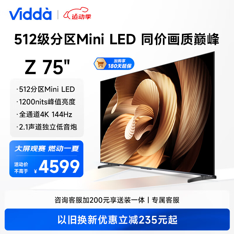 Vidda Z75 海信电视 75英寸 Mini LED 4+64G 512分区 1200nits 240Hz游戏智能欧洲杯大屏以旧换新75V7K价格:4599.00元!