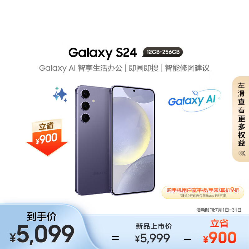 三星(SAMSUNG)Galaxy S24 AI手机 超视觉影像 5000万像素 拍照手机 第三代骁龙8 游戏手机 12GB+256GB 秘矿紫价格:5099.00元!
