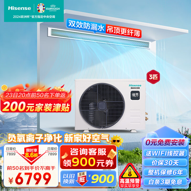 海信中央空调风管机一拖一境界旗舰版一价全包3匹嵌入式 3重净化 全直流变频 1级能效 厂直价格:7899.00元!