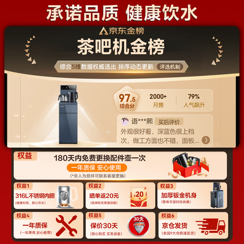 3、必须好评这款茶吧机是我线上线下看了好久选的九阳美的都看了同等甚至高于这款价格的是都不如苏泊尔这款只有苏泊尔的内层不锈钢是无缝的其他的缝隙都可明显这款内层不锈钢还是316的材质更好特地用了一个星期才来评价有什么不懂得问客服都很耐心解答目前使用感受非常好