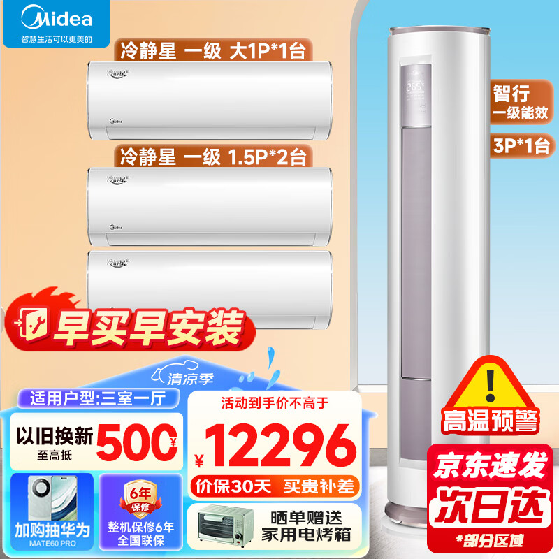 美的空调套装三室一厅 一套购齐 新一级能效 变频冷暖 3匹智行柜机+冷静星挂机(1.5匹*2+大1匹)价格:12296.00元!