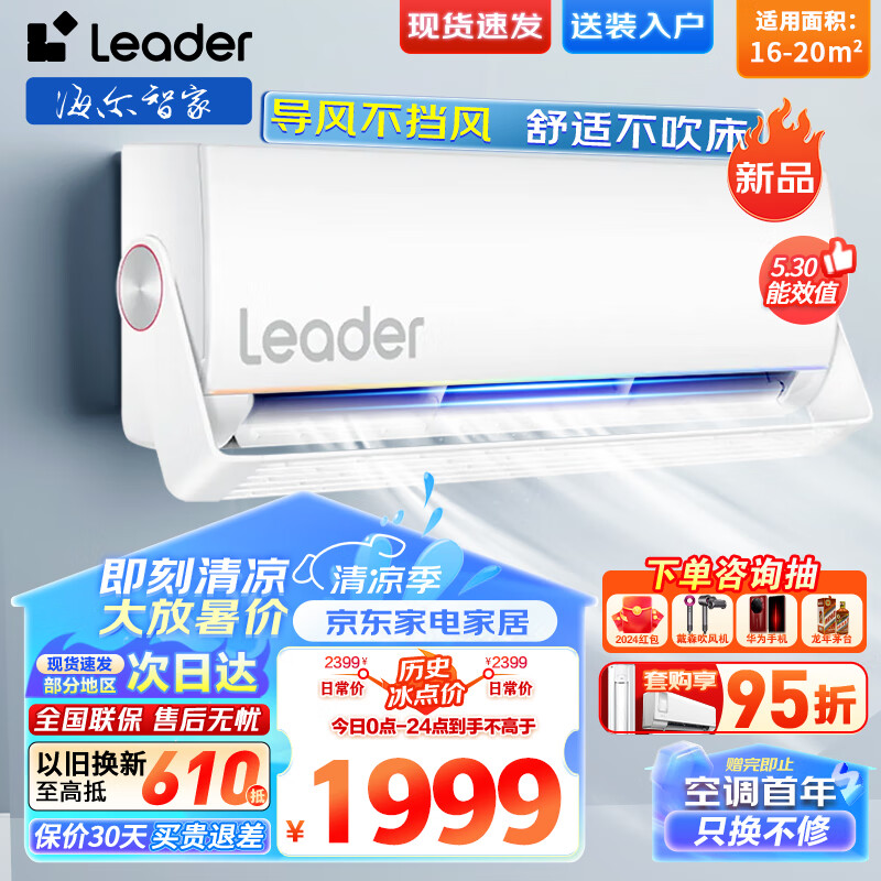 统帅(Leader)空调1.5匹挂机海尔空调出品旋翼防直吹挂机新一级能效 变频冷暖自清洁挂式急速变温35MUE81价格:1999.00元!