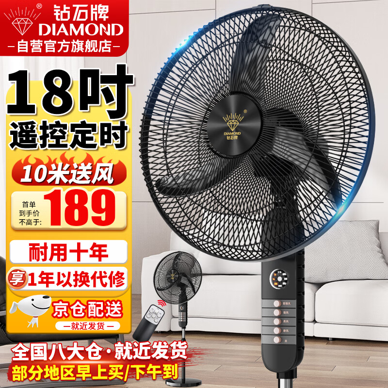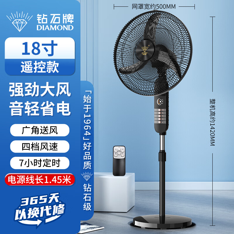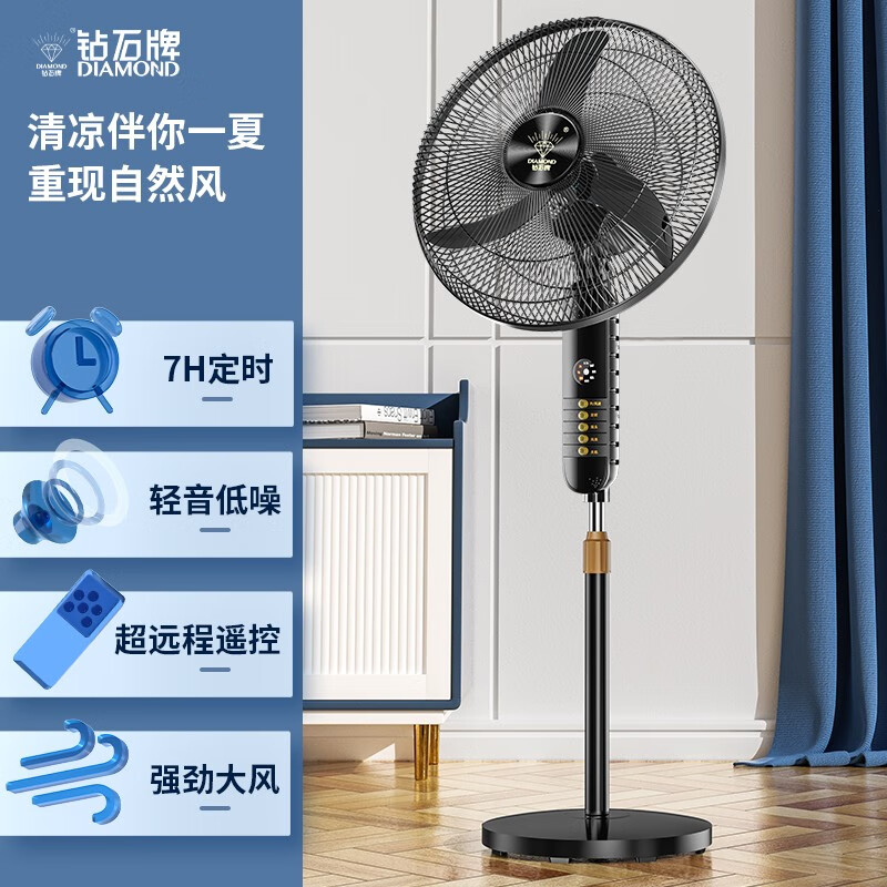 钻石牌(DIAMOND)电风扇家用落地扇办公室立式风扇客厅大风量定时遥控机械摇头风扇 18吋牛角叶【遥控款】价格:219.00元!