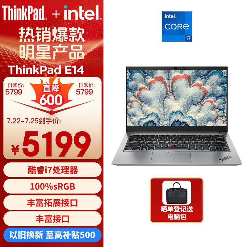 ThinkPad E14 14英寸轻薄便携联想笔记本电脑 酷睿i7-1260P 16G 512G 100%sRGB 银 丰富接口价格:5199.00元!